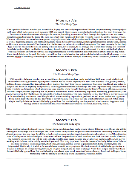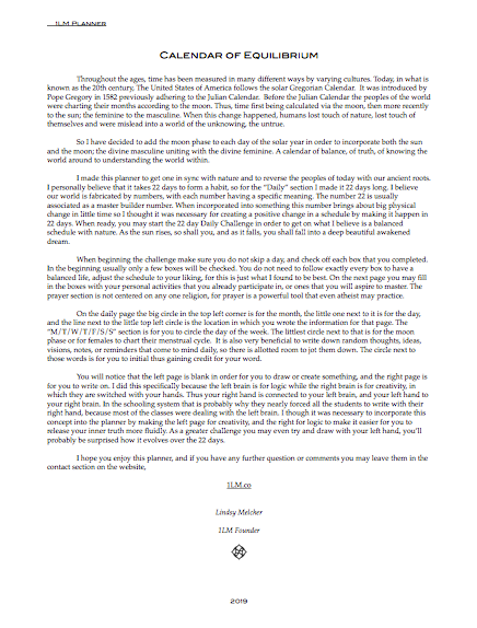 In the ancient world all could view the sun in day and know the hour of day, and the moon by night knowing the day of the month. This calendar is bringing the ancient customs back to the present in order to bring us closer to the nature, to others, to ourselves. This planner includes a body type quiz, a meal plan, a daily plan, and a 22 day custom challenge routine in order for you to master the day. There are also moon rituals for each new and full moon of the year. Enjoy!